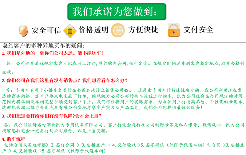 | 2、購(gòu)車流程: | 1、咨詢洽談(電話洽談或來廠考察洽談) 2、簽訂汽車購(gòu)銷合同(傳真、郵遞或者來廠簽訂) 3、我廠按時(shí)按質(zhì)生產(chǎn) 4、交付驗(yàn)收 >>點(diǎn)擊查看詳細(xì)內(nèi)容 |