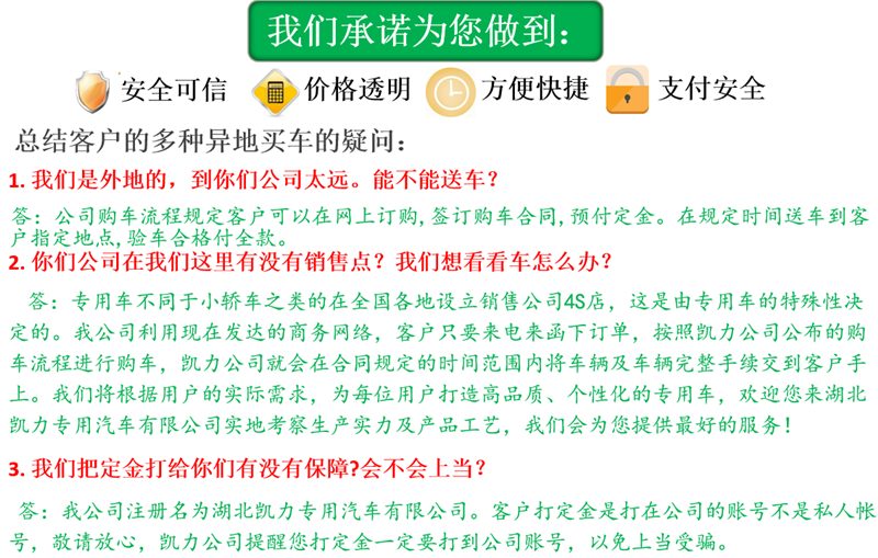 | 2、購(gòu)車(chē)流程: | 1、咨詢(xún)洽談(電話(huà)洽談或來(lái)廠(chǎng)考察洽談) 2、簽訂汽車(chē)購(gòu)銷(xiāo)合同(傳真、郵遞或者來(lái)廠(chǎng)簽訂) 3、我廠(chǎng)按時(shí)按質(zhì)生產(chǎn) 4、交付驗(yàn)收 >>點(diǎn)擊查看詳細(xì)內(nèi)容 |