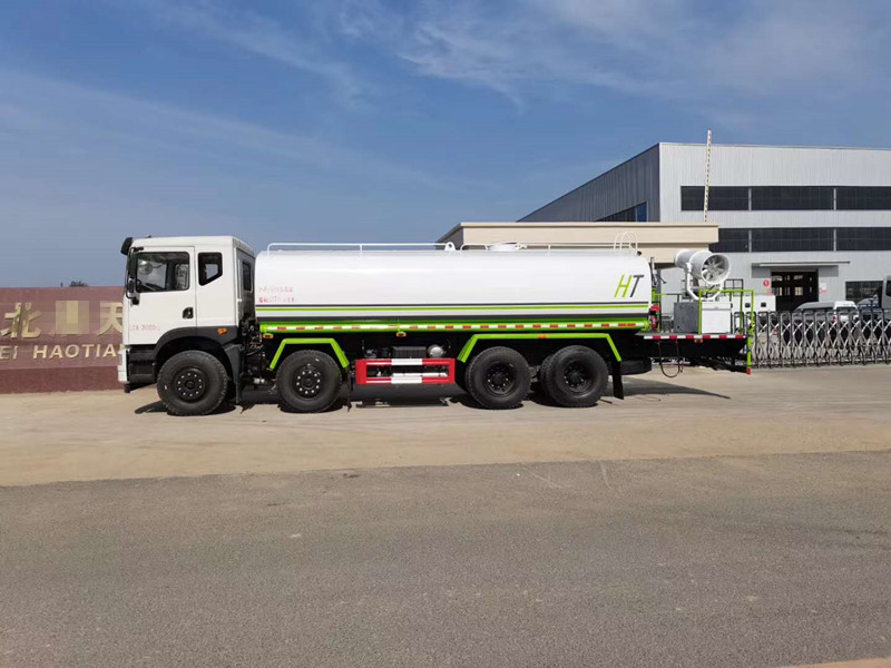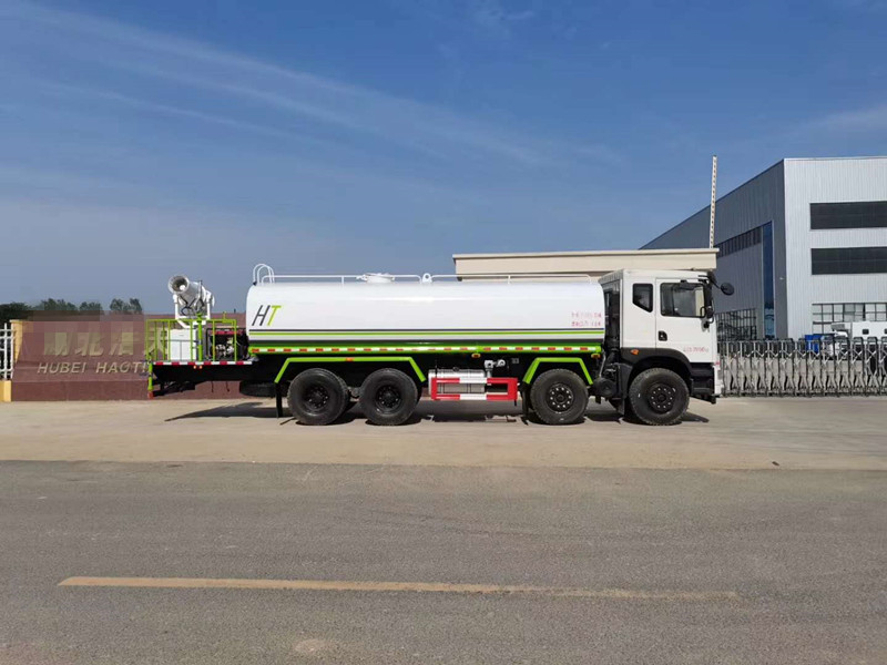 前噴后灑,前裝有鴨形噴嘴或圓頭沖嘴,后面裝有圓柱開(kāi)灑水噴嘴或蓮蓬頭噴嘴,后部有一工作平臺(tái),裝配有高壓水炮。后部還可裝8個(gè)噴嘴(選裝)噴水器一般用于沖洗街道。