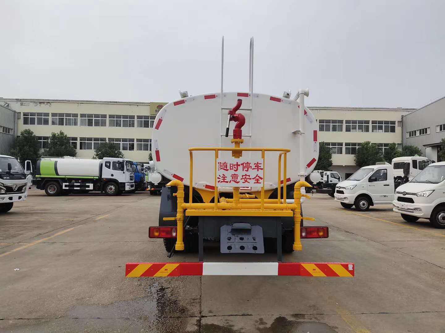 前噴后灑,前裝有鴨形噴嘴或圓頭沖嘴,后面裝有圓柱開灑水噴嘴或蓮蓬頭噴嘴,后部有一工作平臺,裝配有高壓水炮。后部還可裝8個噴嘴(選裝)噴水器一般用于沖洗街道。