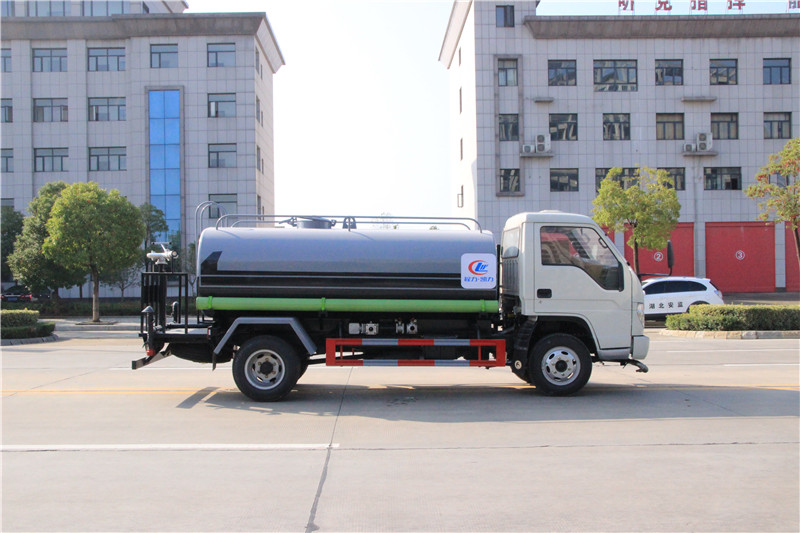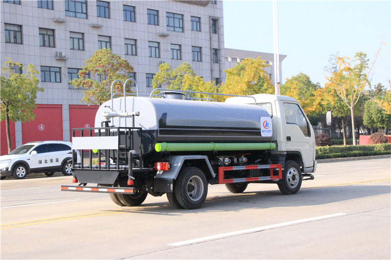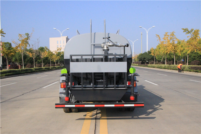 前噴后灑,前裝有鴨形噴嘴或圓頭沖嘴,后面裝有圓柱開(kāi)灑水噴嘴或蓮蓬頭噴嘴,后部有一工作平臺(tái),裝配有高壓水炮。后部還可裝8個(gè)噴嘴(選裝)噴水器一般用于沖洗街道。